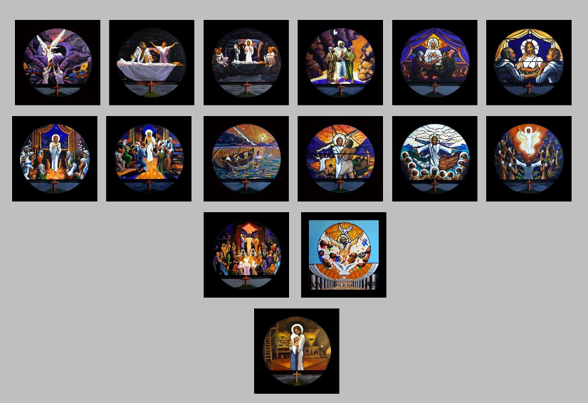 Fourteen Stations of the Resurrection, “stained glass” windows—oil paint on Lexan, commissioned by Padre Jorge Santiago Cartagena SDB