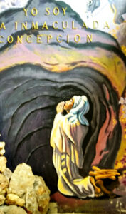 Debajo del Fraile sobre su burro, vemos el milagro de Lourdes, tal como se expresa en la gruta con Bernadette en la fuente de agua donde contempla su visión milagrosa, aquí representada debajo de la estatua de la Virgen María.