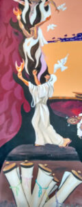 Looking up from the grotto, we witness Christ’s baptism by John the Baptist, and surrounding them, the shadows of Christ’s baptized followers are transfigured into light. Above them and the rocks, Martin de Porres (fellow saint and friend of Santa Rosa) follows faithfully in the path of Jesus, who, on his donkey, descends into the crucible of His trial, conviction, and sentence to death on the cross. Along this path, we see evidence of the Parable of the Sower (…some “seeds fell on good soil and brought forth grain “(Matthew 13).