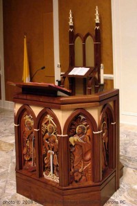High relief wood carvings of 6 saints by Vonn Hartung, in ambo at St. Paul’s Catholic Church, Pensacola, Florida (photo by Steven Schloeder/Liturgical Environs PC)