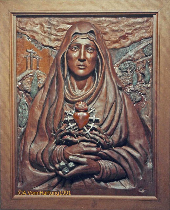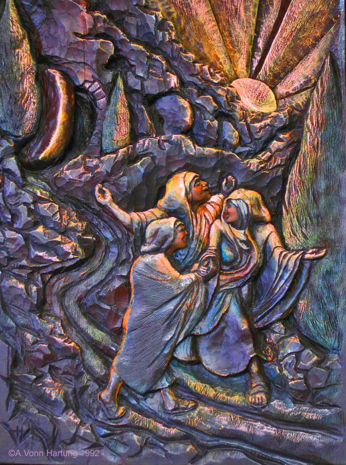 A. Vonn Hartung painter and sculptor, has molded this historic fact into a moving wood sculpture carved on the sacristy door in a chapel in the metropolitan area. This work, entitled “He is Risen”, forms part of an ensemble which also includes “The Holy Cross” and “The Sorrowful Mother”.